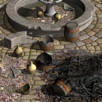 The Plaza is an immensely versatile scenery set. All four walls, plus the Dais, the Fountain, and both Statues, are set up as body parts so that you can hide or move them around as you please. You can load in the base scene by itself, or load it in complete with all the dead leaves, broken wine-jugs, and other rubbish. Numerous 'trash' props are provided so that you can further litter up the scene as you wish.