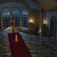 Throne Hall 2 is indoor and outdoor environment prop set, consist of throne room, crown on wooden stand, carpet, lit torches, ground, as well as opened and closed castle door.