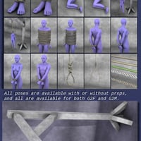 Tied Up! 2 For Genesis 2 Male(s) and Genesis 2 Female(s) is a set of props, smart props, poses and pose + prop special loaders. The special loaders apply a pose and smart props to the character at the same time, giving you shortcuts to having characters hanging by the neck, bound hand and foot, etc.
