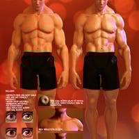 The toon hero comes with three realistic and three toon eye materials. Dry and wet mat settings, barbarian mat settings, and a water drop geoshell. The package also includes a neck reduction morph in case you think I went overboard on the trapezius muscles. An additional "iris sink" morph helps to better capture the look often seen in animation, where the light reflects off of a deeply angled in iris.