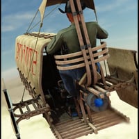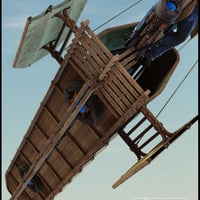 The TraderDL is a second flying machine in the Desert Lands collection, and is used mostly by merchants for transporting small amounts of goods. This 3D science fiction vehicle is built on a wood and metal frame and then covered by an animal skin. Like Hunter DL, it has two vertical and one horizontal electrical pulse engines and a generator.