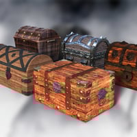 Six pirate treasure chests, aged and weathered, arranged as separate closed props.