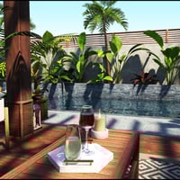 With cozy areas to sit and relax and a large pool to cool off, all surrounded by tropical greenery and beautiful wood, Tropical Retreat can be enjoyed alone or with friends.