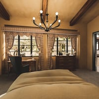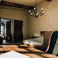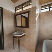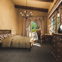 A room inspired by Mediterranean touch. It has a bathroom in it which has a bathtub with a large window glass beside it, a toilet and a sink. The bedroom is very neat and elegant.