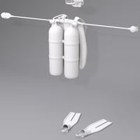 Modern Scuba Gear with an inflatable buoyancy control cell. This set includes a conforming harness, dive mask, fins and a weight-belt-prop. It has multiple adjustment morphs for maximum compatibility and many pose controls for easy posing.