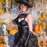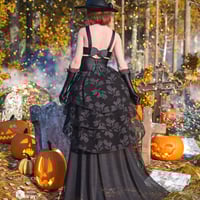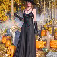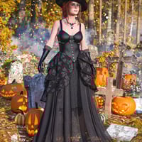 A Halloween inspired add on pack for the Universal Dress that includes an overskirt, overskirt short, shoes, corset, gloves, hat, necklace and earrings.