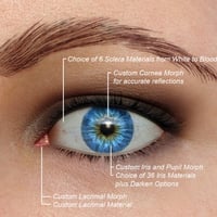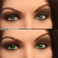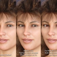 While the many colors available are a key feature, the core of Ultimate Eyes is a set of morphs covering the cornea, the iris and pupil and the lacrimal. The cornea is reshaped to be much more physically accurate, resulting in realistic reflections and to catch lights which are essential to achieving realistic eyes. The iris is made subtly concave to catch the light (a technique much used by leading animation studios) and the lacrimal is made very realistic with a combination of a custom morph, maps, and shaders. And because these use the regular eye model, they can be combined with any other eye morphs that you already have (such as the Eyes Pupils Slit morph).