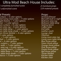 Ultra Mod Beach House is a complete interior and exterior set. You can load the house furnished with 21 furniture props. The props can be used with other products as well. If you have furniture you wish to use, you can load UMBH unfurnished.