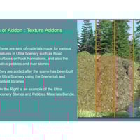 - How ecologies add-on offer sets of trees, plants, grasses, and rocks, which UltraScenery utilizes to populate landscapes, sometimes coming with their own specific terrain and road textures.