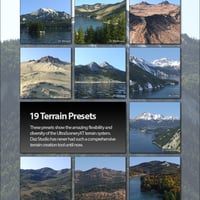 This plug-in uses noise generators or height maps to create the terrain to which you can then apply erosion filters, stratification filters, smoothing, and displacement. There are endless possibilities.