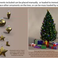 The tree comes in six color variations, white, pink, blue, and three levels of green, but you can set up the exact color you want in the blink of an eye. You can load them already decorated and render them, or you can add your own decorations, either by placing the various ornament props where you want or by using a script automating the random placement of random ornaments on the tree so that you just have to decide which ornaments you keep or not and which ornaments you reshade. You can even replace some ornaments with other ornaments using the special “replace” versions of the ornament props.