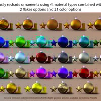 Concerning the ornaments, the light garland comes with material presets allowing you to change the tree colors emitted as well as their intensity. All the other ornaments, balls of various shapes, stars of various sizes, socks, can also be modified using one of the four material types associated with one of the many colors all included as shader presets, and can be easily rescaled as you like. These ornaments can be loaded as is or can be loaded in a replacement version, allowing to replace on the tree a given ornament by another one.