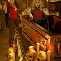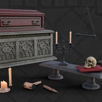 The intricately designed coffin and altarpieces include multiple finish options in wood and stone, red and black velvet interiors, plus handy add-to actions to snap together individual props. A tilt-up pose lets you set the coffin against any wall for easy stand-up use.
