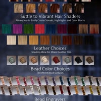 Vega Hewn Hair is an exciting, unique hairstyle with endless possibilities! 13 detailed, 3 dimensional base colors to start you off. A whooping 27 material zones in organized sections for easy highlights, lowlights and color blocking. With shader colors ranging from vibrant to subtle you'll be sure to get the look your after. There are 8 different zones for the beads with 14 colors in 2 different styles. Customize them even more with 4 different engravings. There is even a one click mat to remove the beaded strands completely. The ponytail ties contain 2 material zones and 8 different leather choices.