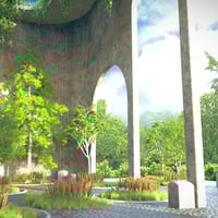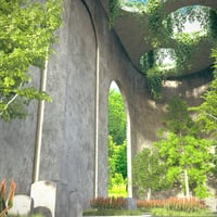 Explore the beauty of contrast in this Vegetation Scene with Concrete Arch Structures, where lush greenery weaves through weathered, modern architecture.