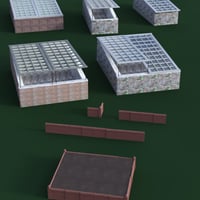 A set of single and double cold frames which were and still are used to protect delicate plants from the elements in both single and double format with lids up and down and several different material presets from new brick to very old jumbled bricks to better blend them in to the surrounding scene.