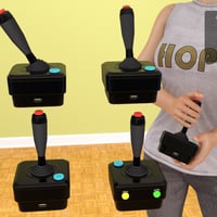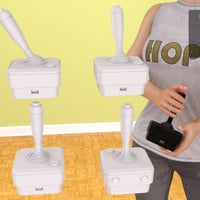 A set of video game controllers for Genesis 8 males and females. There is a uniquely styled game controller that has two glowing thumb-balls and 6 buttons, a WiFi enabled joystick, two virtual reality (VR) handsets (left-hand and right-hand specific), and a cable-free VR headset. The buttons on the controller come with depress morphs. All the joystick’s buttons move and the ‘stick’ itself is rigged for movement front-to-back and side-to-side. The thumb-sticks on the VR handsets are rigged for movement and the trigger has a “trigger-pull” morph. On the VR headset, the headphones and attached antennae are rigged for movement and adjustments. The VR Headset comes in a choice of 4 colors while the other devices are issued in standard black plastic with rubberized highlights.