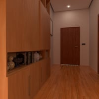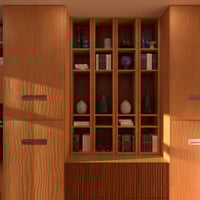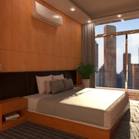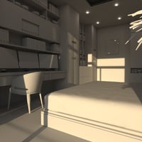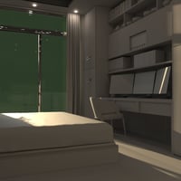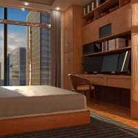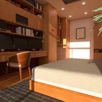This sleek environment features a triple-monitor workstation, custom wooden shelving, and stylish décor elements that bring both function and sophistication to your renders.