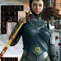 Vo Golden Cudgel and Monkey Boxing Poses for Genesis 8.1 Female comes with 4 preset golden cudgel objects and materials, 6 monkey boxing poses, and 10 Vo Stick Method Poser poses.