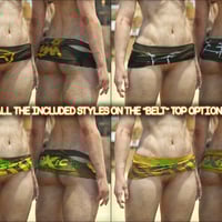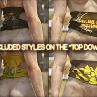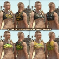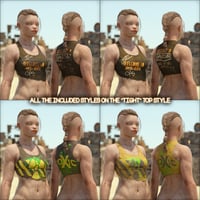 This set includes 8 different top styles, optimized to work as flawlessly as possible, and 5 new graphics for any kind of post-apocalyptic setting, whether real or make-believe. The Range from new styles, like the "Tight" (skin-tight) and the "Short" styles, to more occasional ones, like the "Behind the Head" or "Shoulder Down" tops.