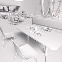 an ultra-detailed interior with kitchen, counters, cash registers, and mismatched furniture