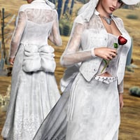 There's going to be a wedding in Dazville! Victoria shines in her bridal apparel, including an off-white, long-fringed silky skirt, matching vest, and a suede-chiffon jacket -- all three decorated with diamond accents. Accessories include a long train of sheer lace, a bustle to give it that extra touch, a diamond studded belt and more!