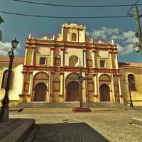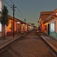 Walk this narrow cobblestone street in a small Mexican town with a church at the end.
