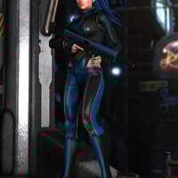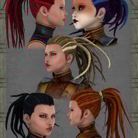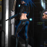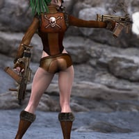 A complete Sci-Fi Clothing Set for your Genesis 2 Female(s) that includes a one piece suit that can transform into a crop top and panties, pants that can transform into shorts, a bolero jacket, boots, gloves, dreadlock ponytail hairstyle, goggles, a respirator, and a morphing firearm that transforms to a sub-machine gun, carbine, and sniper rifle.