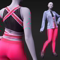 The includes an open denim jacket with several shoulder-off options and unbuttoned cuffs. It also includes a tank top with cross straps that helps to enhance the silhouette, a legging with side decorative seam, and a pair of cool trainers. The set includes two texture options.