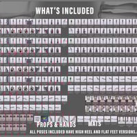 The set includes 25 base poses (25 flat feet and 25 high heel), plus mirrors and partials, with a focus on the little details, such as lifelike hands, natural positioning, and mix-and-match capabilities.