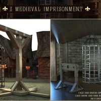The Cage door opens and closes, the same goes for the wooden stocks. The Poses have been carefully adjusted for Genesis 3 and 8 Male and Female.