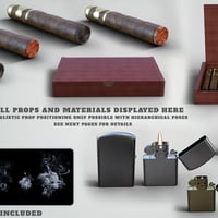 The Props include a Fresh Cigar, a Used Cigar, a Cigar Box and a Crystal Ashtray as well as Bonus Smoke PNGs to add that extra effect. Some of the Props have numerous materials to choose from.