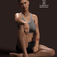 Optional cuts and bruises Layered Image Editor overlays are included for the face, arms, legs and torso. These can be applied separately or all together.